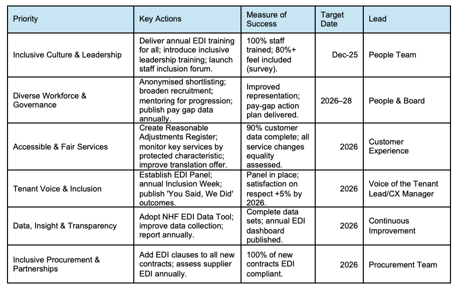 - Annual EDI and People Report published for staff, residents and partners. - Progress will be benchmarked against national housing sector data via the NHF EDI Tool.
